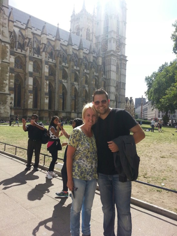I read my twitter page on the morning of August 6th & read Nathan’s tweet, he was in the UK and visiting London TODAY ! Well that was worth a trip to London, so suggested to my daughter Abbie if she fancied a shopping trip, oh and to include a meet with Nathan & Sarah X That was a yes to the shopping & come along to Westminster Abbey to keep me company and meet them. After the shops made our way to the Abbey and sat and waited & then they arrived having a Tour Guide show them around, good idea. But having travelled early that morning attending the ‘Hearing Fund UK Gala’ in Leeds, they were tired with all the Tour walking ! Abbie & I had a lovely time with Nathan & Sarah, a lovely couple. We talked for a long time and had photos taken, all very exciting.